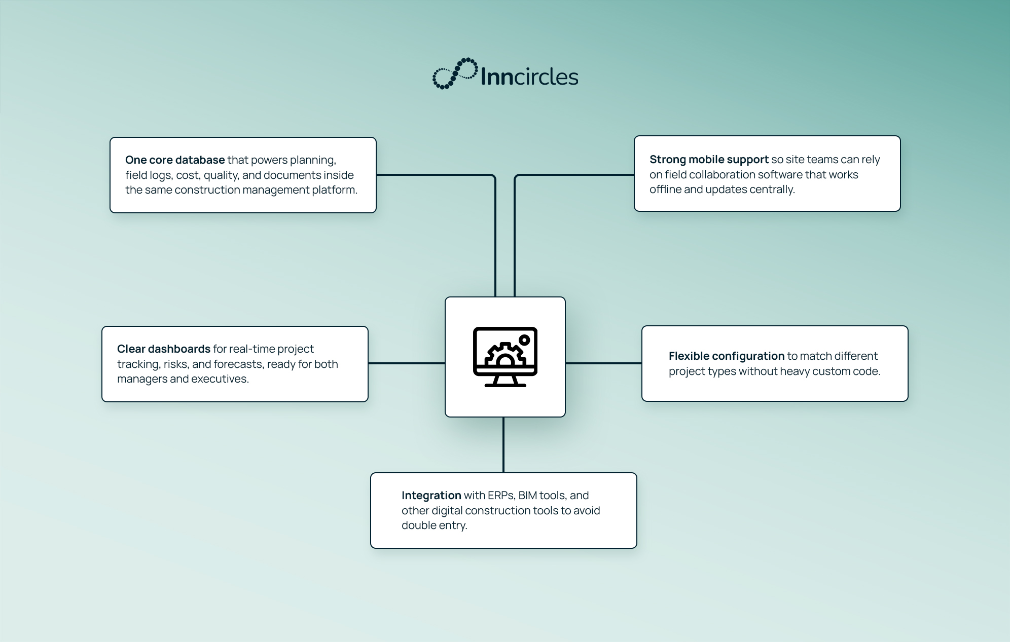 Many products promise to unify workflows. Inncircles actually builds that structure around real-world construction. It offers integrated construction software that combines planning, site operations, contracting & billing, data analytics, and dashboards all in one integrated platform.