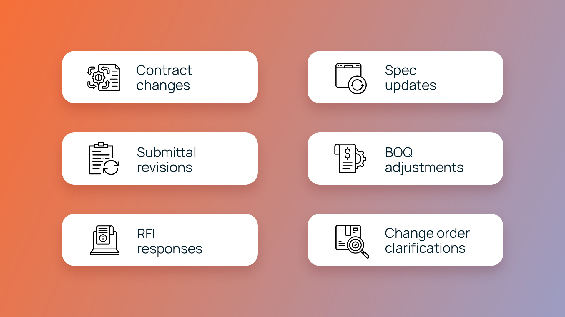 Construction moves too quickly for teams to track every update manually. Documents shift constantly, whether through new contract terms, updated spec details, evolving change order requests, or ongoing RFI cycles.