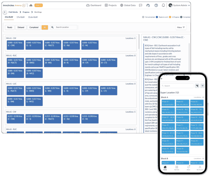 Site teams across projects began using mobile-based workflows to report daily execution. This included raising Requests for Inspection (RFIs), recording daily worklogs with executed quantities mapped directly to BOQs, capturing geo-tagged photographs, and flagging physical obstructions or constraints.