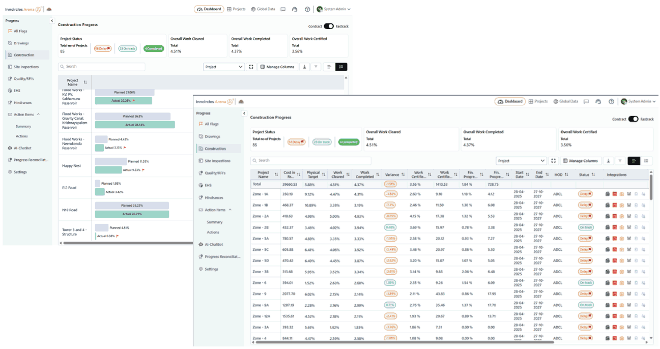 To address this, APCRDA adopted an integrated ICT-based construction management approach, implementing Inncircles Arena in collaboration with Nippon Koei India Pvt. Ltd. and Inncircles Technologies. The objective was clear: establish a single, reliable view of execution that leadership, engineers, and consultants could trust.