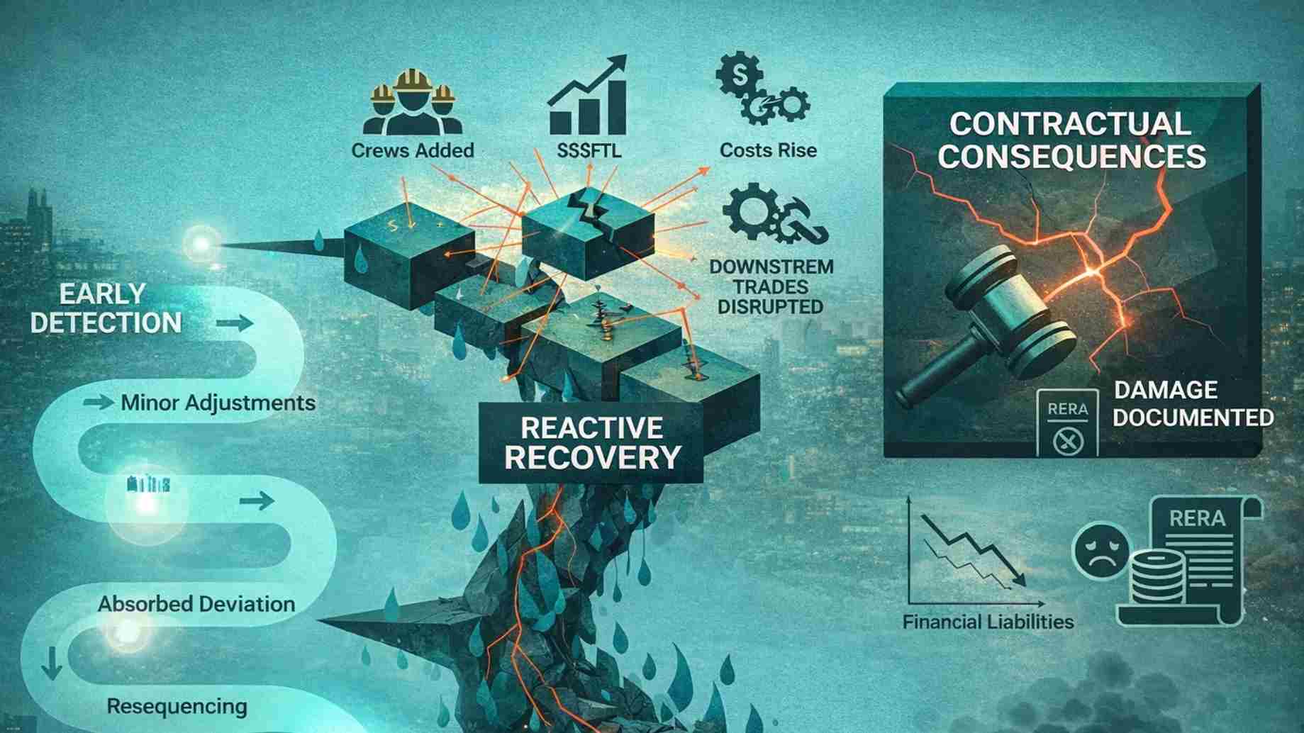 Early deviations can be absorbed through resequencing or minor adjustments. Late deviations force reactive recovery. Crews are added. Costs rise. Quality risks increase. Downstream trades are disrupted.